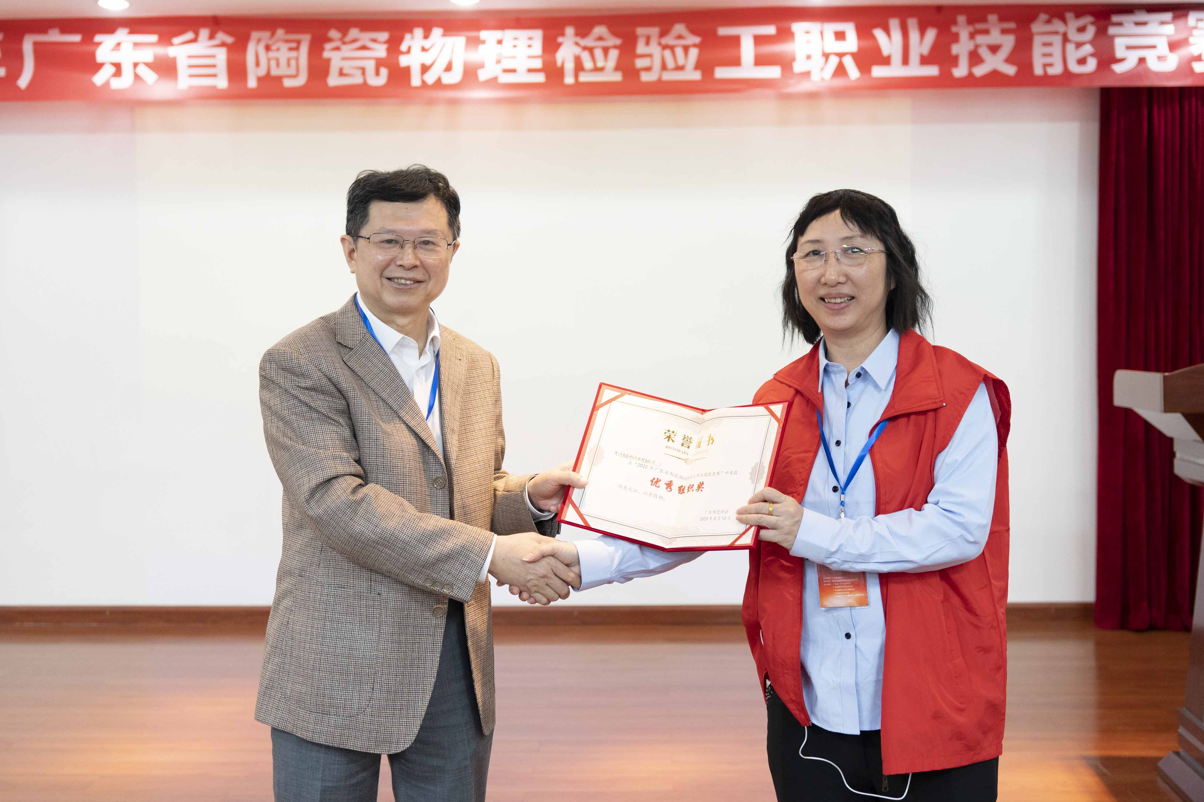 現場領導嘉賓們為本次競賽中獲得優異成績的參賽選手進行了頒獎同時,陳環會長為本次競賽承辦方佛山市陶瓷研究所檢測有限公司頒發優秀組織獎。